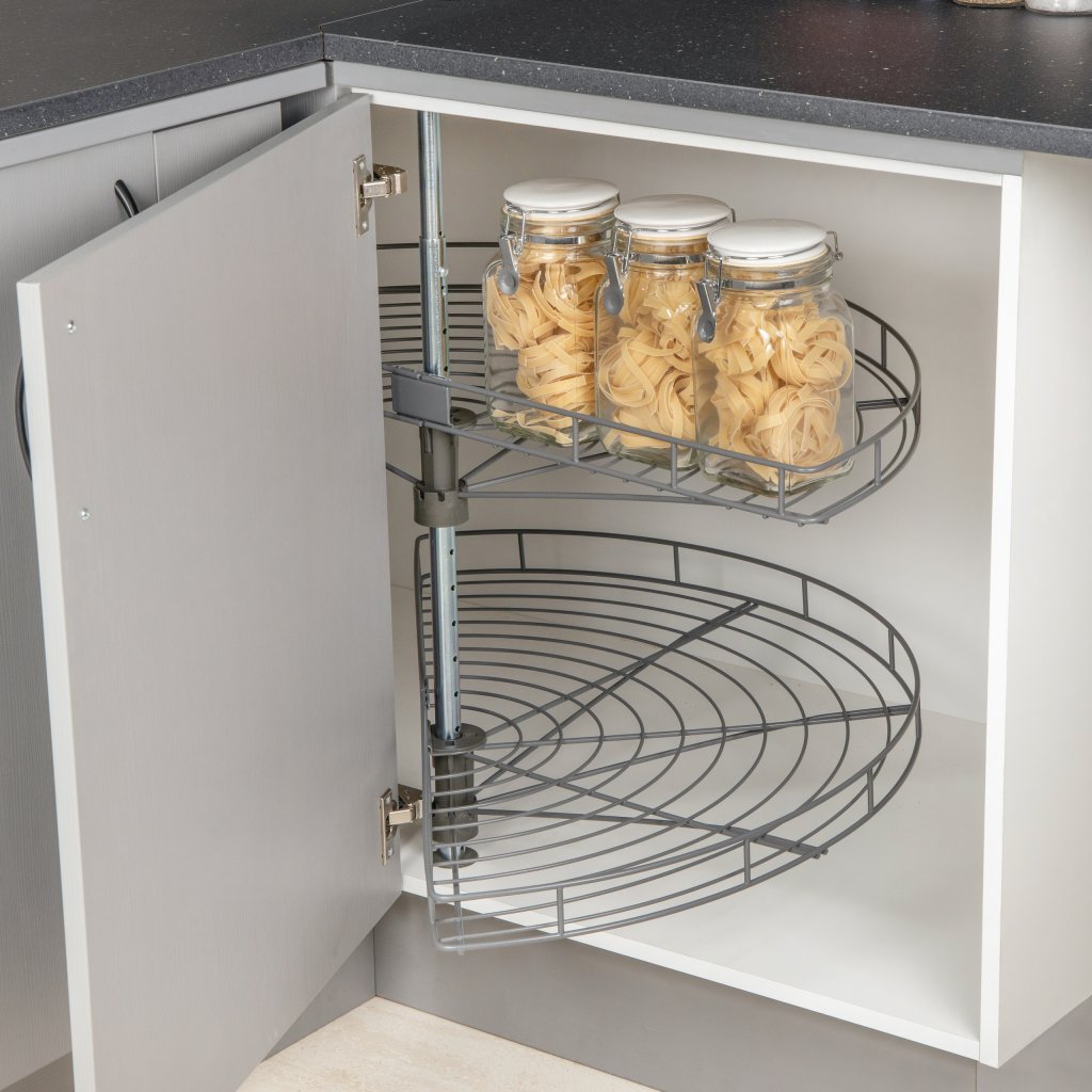 Hörnskåp kan vara svåra att utnyttja fullt ut. Denna halvkarusell i antracit skapar ordning, överblick och smidig åtkomst med två stabila hyllplan som roterar mjukt. En genomtänkt lösning som gör köket mer funktionellt i vardagen.